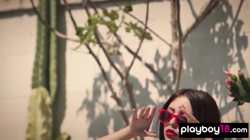 Petite beauty reveals her hairy pussy by the pool outdoor