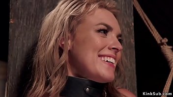 Pretty hairy pussy blonde trainee in hardcore bondage with one leg in the air gets whipped then sucks big dick and waits for fuck in dungeon