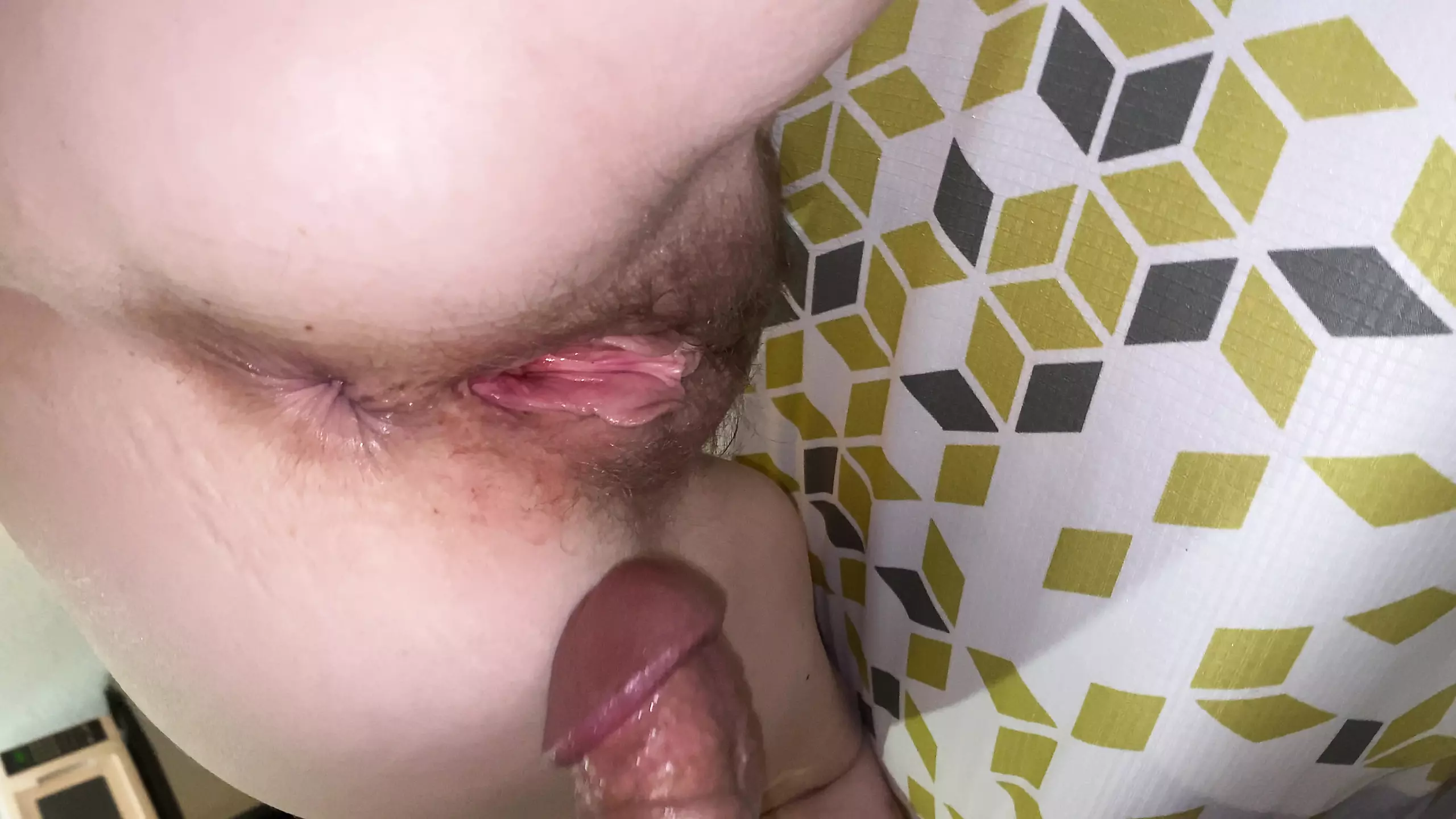 Blonde milf spreads her hairy pussy and ass and gets fucked by a fat young hairy cock