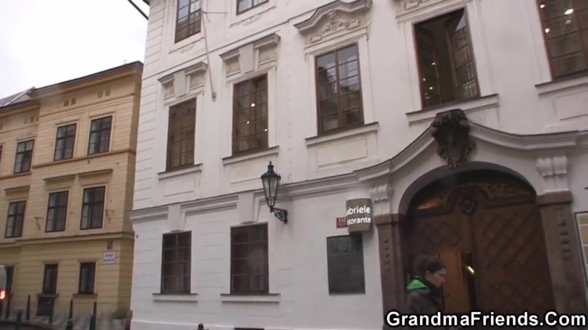 Hairy granma in red lingerie swallows two dicks